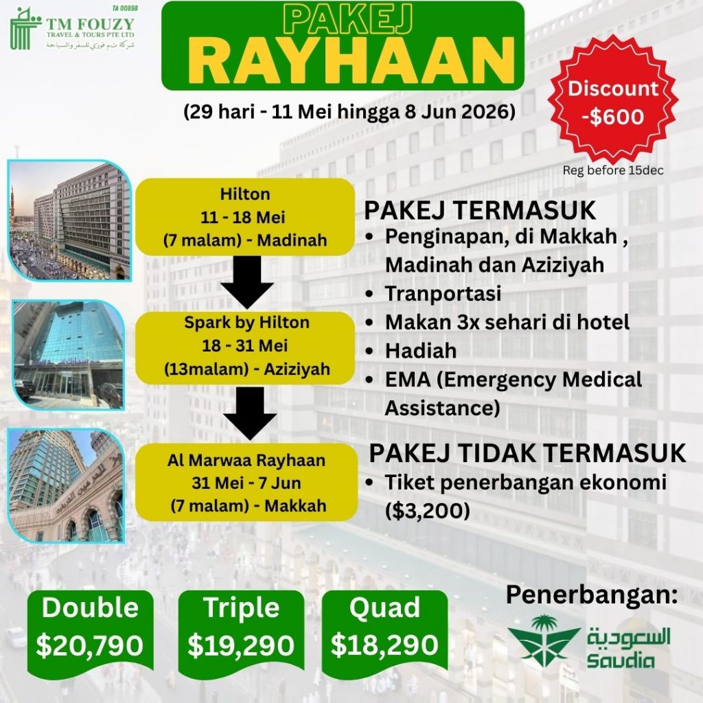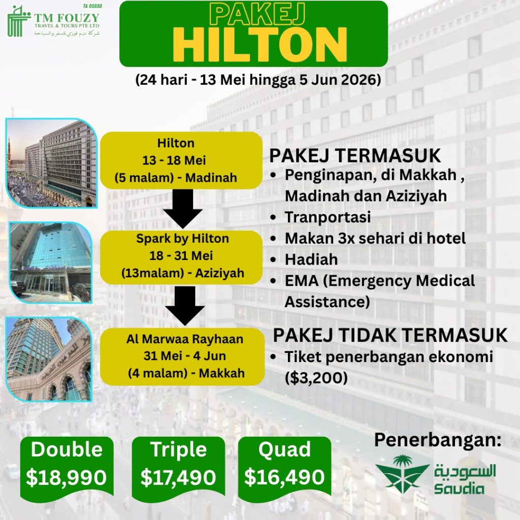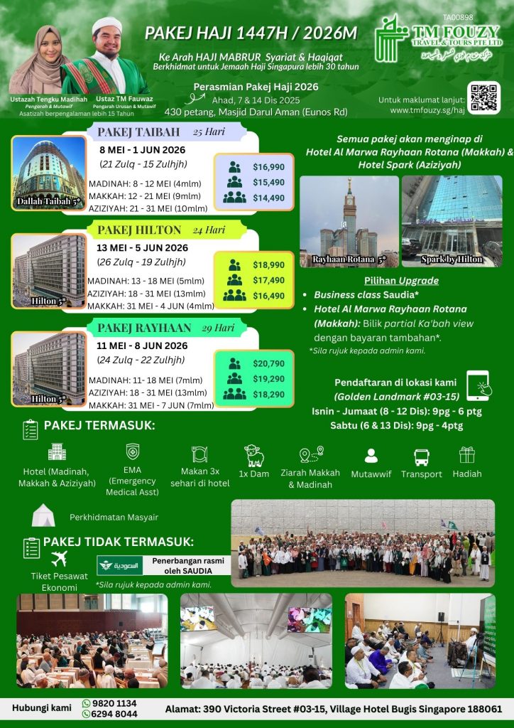 hajj 2026 Pakej Haji 1447H / 2026MKe Arah "HAJI MABRUR" Syariat & Haqiqat, Jasmani & Rohani MAKKAH Semua Jemaah Akan Duduk Di Hotel Rayhaan (Clock Tower) & Spark By Hilton (Aziziyah) MADINAH Kindly Fill These Forms TMFouzy Registration Form Reference TM Fouzy Travel Package Schedule PackagePayment Schedule Hajj Package Purchase Contract PDF